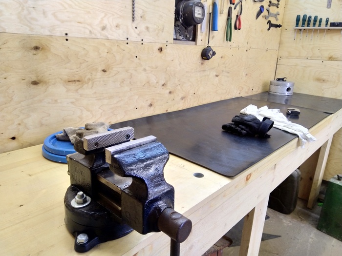 Сделав основной каркас, сверху на саморезы и клей приделал мебельный щит, для того, чтобы поверхность верстака была идеально ровной. Теперь, что самое главное на верстаке?! Конечно тиски!. То говно, которое продавалось в магазинах меня не устраивало, заказывать что-то по серьезнее не было ни денег ни возможности, в итоге я бросил клич по друзьям с просьбой добыть, найти, спиздить или откопать мне советские тиски. Один из друзей понял всё буквально и в прямом смысле откопал на своём участке старые, задроченные советские тиски. Я хз, какая у них предыстория, но судя по их виду, они были закопаны как клад, дедом моего кореша на его дачном участке, чтобы..... Короче (фото 8)