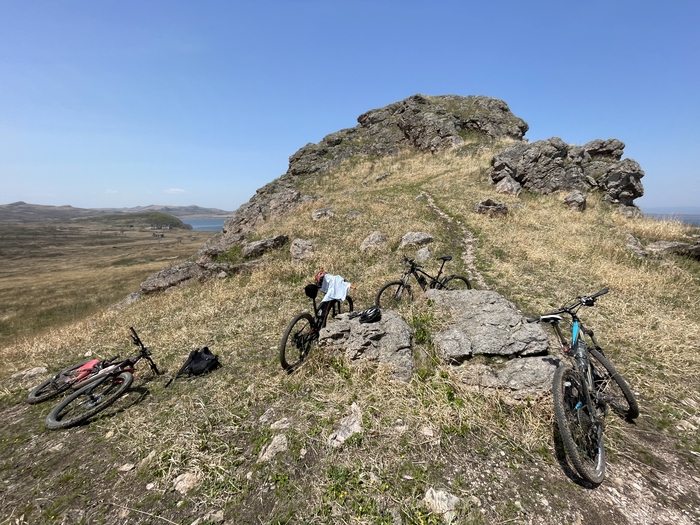 Вниз катить с этой сопки то еще "удовольствие", гдето пол пути это ебучие камни, на которых я словил змеиный укус) На видео слышно характерный звук предстоящей замены камеры. (переднее колесо у меня бескамерное, а вот заднее ни в какую не смог подружить с бескамеркой)