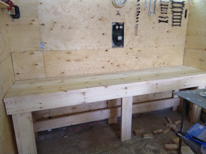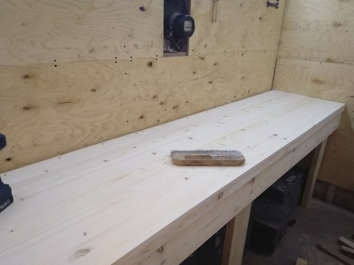 После монтажа фанерных листов я приступил к изготовлению верстака. Материал на него не жалел, так как понимал, что строение это должно быть монолитным и неподвижным. Поэтому закупил 50мм доску и мебельный щит на саму столешницу, приступил к работе (фото 4, 5, 6, 7).