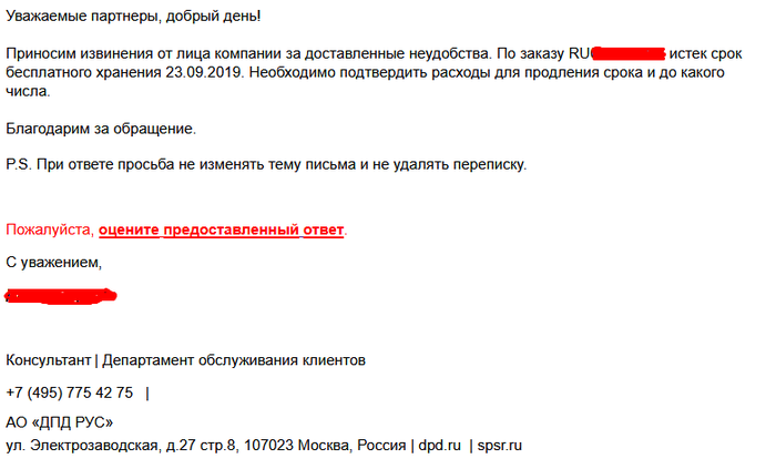Десятки звонков на горячую линию, постоянный контакт с личным менеджером, регулярные звонки от заказчика в DPD. И знаете какой результат? НИКАКОЙ! Виноватые голоса бесконечно меняющихся манагеров с call-центра предлагают каждый раз новые даты, и в лучшем случае на завтра))) Сроки горят, пукан горит, заказчик напрягается.