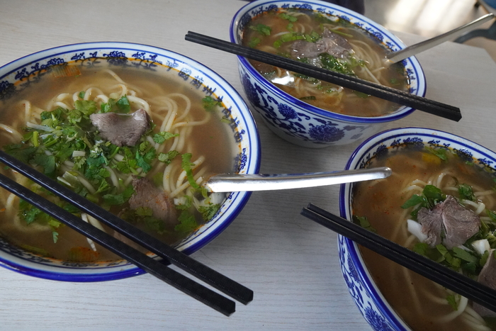 Так подошло время обеда, не решив куда мы пойдем кушать, мы просто отправились на рынок возле нашего отеля, чтобы прикупить продуктов и о чудо, мы нашли Ланьчжоускую лапшичку 牛肉拉面(niuroulamian) лапша просто отменная находится вот здесь. И название рестика 兰州正宗牛肉拉面 (lanzhouzhenzong niuroulamian).