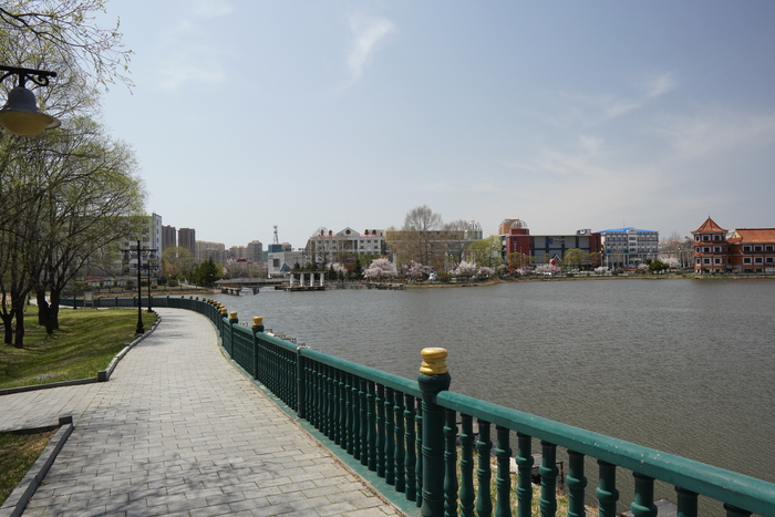 В парке стало еще холоднее чем днем, поднялся ветер, пришлось хорошенько закутаться в одежду, чтобы хоть немного прогуляться по дамбам на реке. Отсюда открывается красивая панорама на Уссурийский проспект 乌苏里大街 (wusuli dajie)