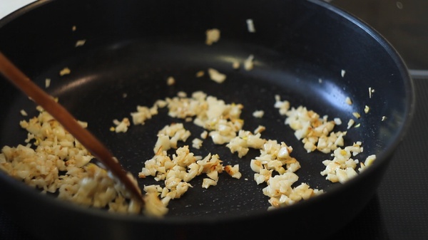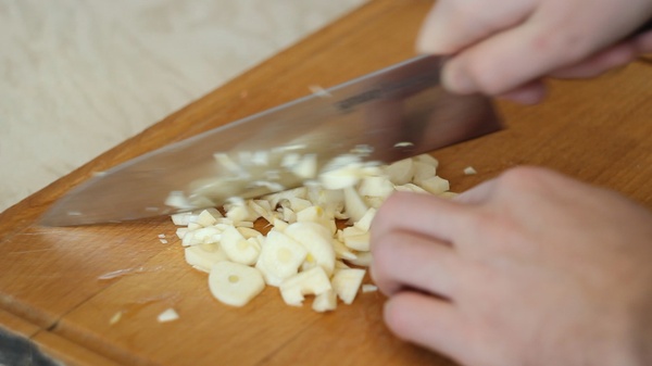 1. Нарезаем мелко чеснок и выкладываем его на сковороду, которая уже нагрета. Готовим на среднем огне, постоянно помешивая, в течение 1 минуты.