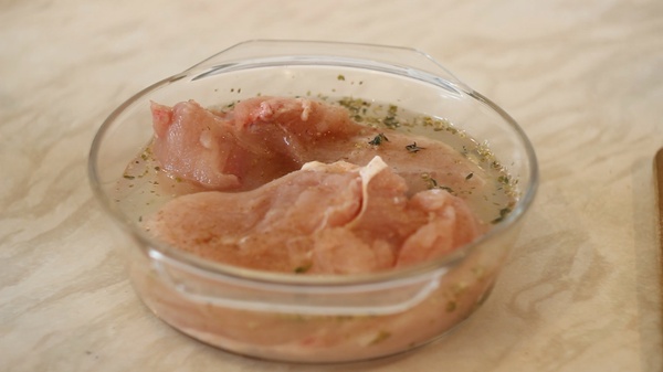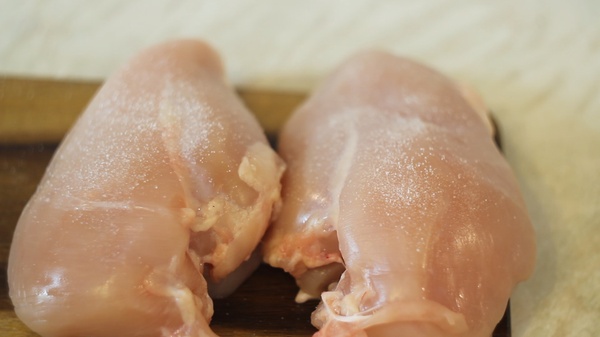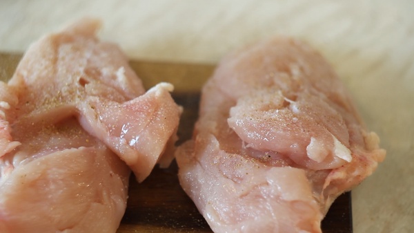8.  Приправляем обе стороны куриных грудок солью и перцем, по вкусу.