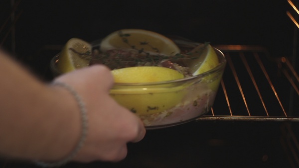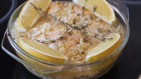 10. Выкладываем сверху обжаренный чеснок, добавляем 4 дольки лимона и добавим несколько веточек тимьяна.