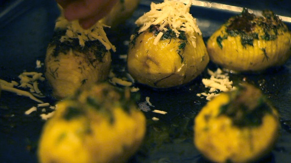8. По истечению 50 минут, достаём картошку и посыпаем сыром.
