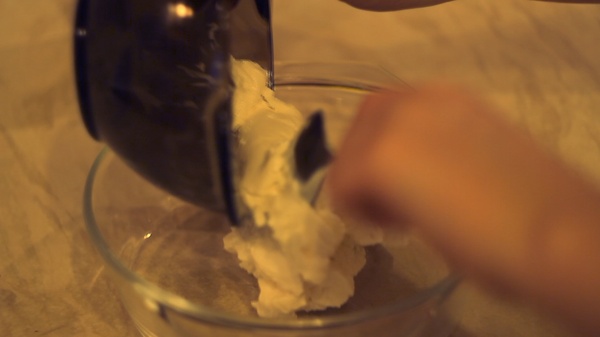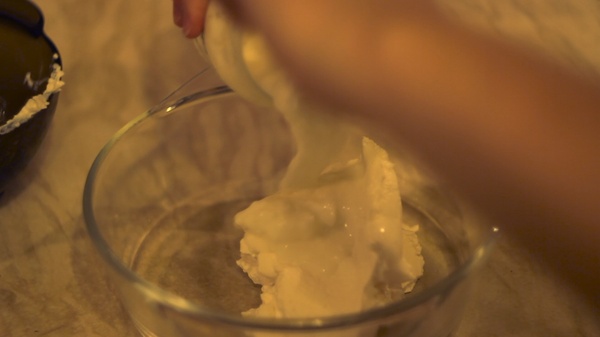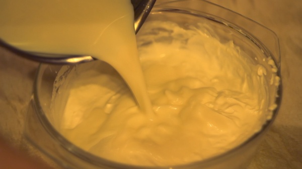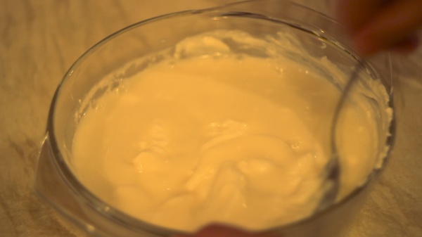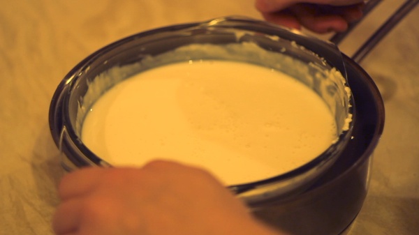 5. Ставим нашу смесь в ёмкость с холодной водой, можно в воду добавить лёд, чтобы она была еще холоднее. В процессе охлаждения периодически помешиваем, особенно от стенок, где смесь застывает быстрее, через некоторое время масса станет вязкой, похожей на йогурт или сметану.