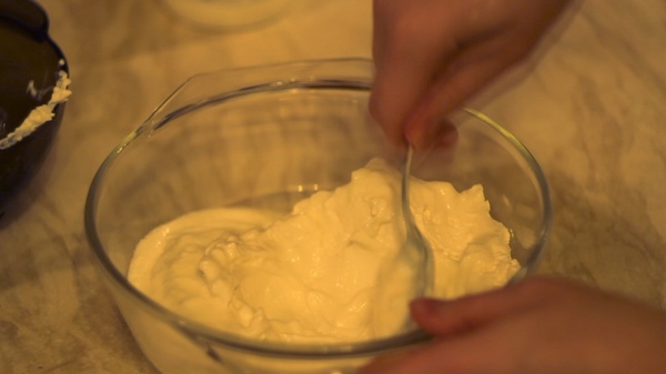 2. Перекладываем творог с йогуртом в блюдо и перемешиваем всё до однородной массы.