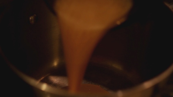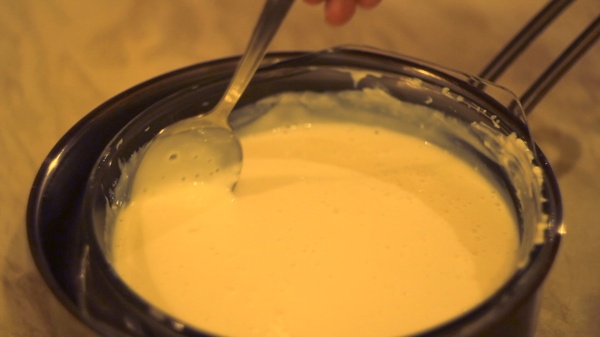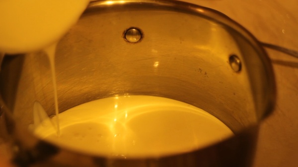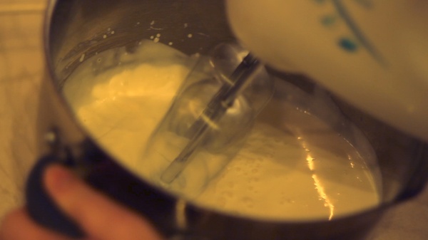 6. Переливаем смесь в кастрюлю и взбиваем её мисером, в течении трёх минут.
