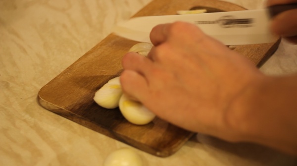 2. Одновременно с тем, пока варятся наши макароны, нарезаем лук кольцами.