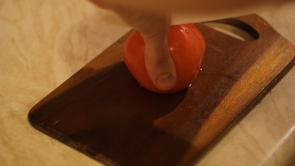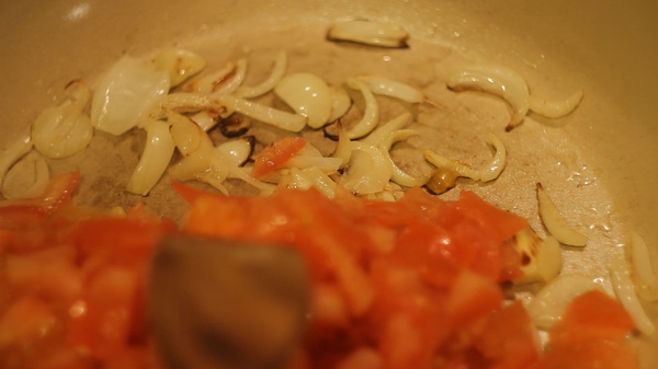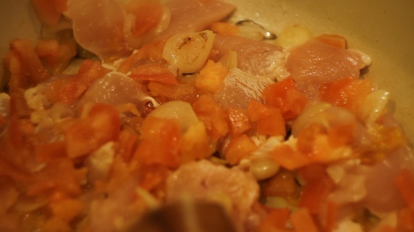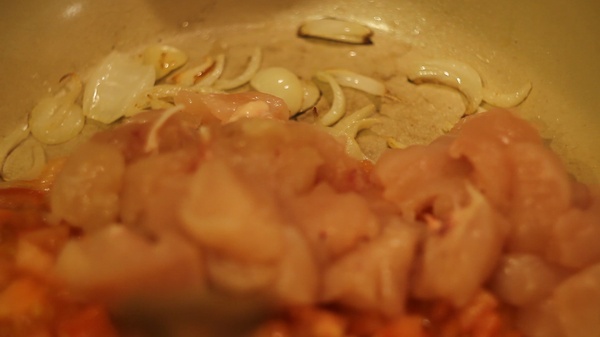 6. Как только лук обжарится, добавляем к нему нарезанные помидоры и куриное филе.
