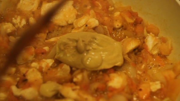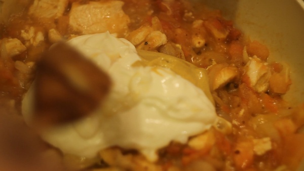 8. Выкладываем горчицу со сметаной. Перемешиваем и оставляем тушиться на три минуты.