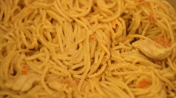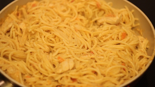 9. После того как прошло время, добавляем спагетти. Перемешиваем и оставляем томится на умеренном огне в течении пяти минут. После этого наше блюдо готово. Приятного аппетита!