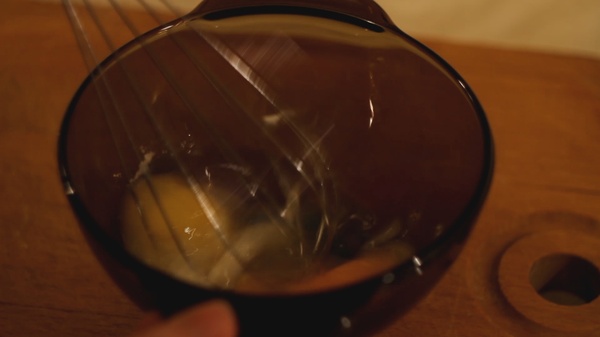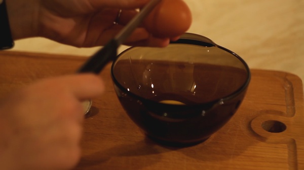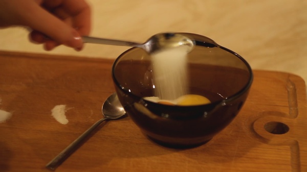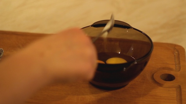 7. В то время пока масса остывает, мы разобъём два яйца в пиалку, добавим туда соли и соды и тщательно перемешаем.