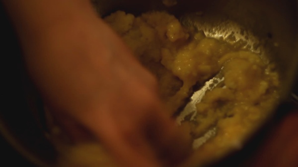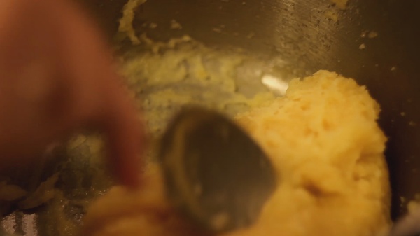 8. Переливаем в кастрюлю и добавляем нашу массу. перемешиваем руками, чтобы не осталось комочков.
