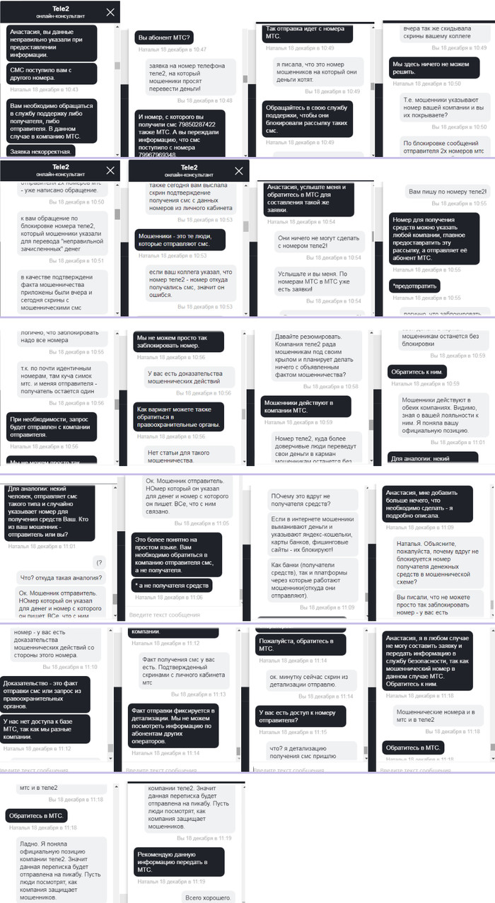 В недоумении пишу снова в чат теле2 на что получаю шедевральный ответ о том, что это я указала неправильные данные при регистрации жалобы, мол смс пришла с номера теле2. Дальше развернулась умопомрачительная переписка о том, что блокировать номер мошенников они не будут. Ведь мошенники это те люди, что смс отправляют, т.е. юрисдикция МТС, а факт подтверждающий, что мошенник отправил смс - детализация из базы МТС об отправке или запрос от правоохранительных органов! И вообще это все мошенники у МТС, а не у них.