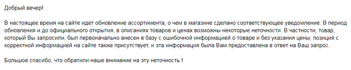 После такого ответа ушла б несолоно хлебавши, но на помощь приходит ФЗ "О защите прав потребителей", а точнее три статьи: ст.10 п.1, ст.12 п.4 и ст. 26 п.1. В кратце там говорится о том, что продавец обязан информировать о цене, несёт полную ответственность за ненадлежащую информацию о товаре и, наконец, самое важное - договор купли-продажи заключается путём ознакомления потребителя с предложенным продавцом описанием товара. А из ст.433 ГК РФ вычитала, что момент заключения договор признается заключенным в момент получения лицом, направившим оферту, ее акцепта, т.е. после подтверждения компанией моего заказа.