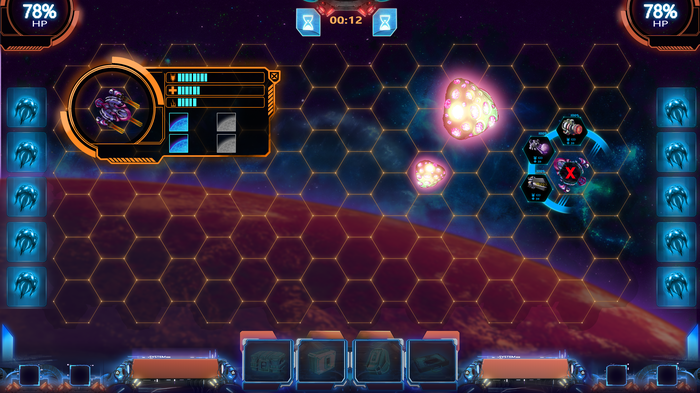 4.1) Игровое поле: Сражения происходят на поле боя 3 размеров – 8х5, 12х7 и 16х9 шестиугольников (хексов). На поле боя могут также размещаться неподвижные объекты – малые и средние астероиды или иные объекты. Астероиды блокируют стрельбу, что позволяет кораблям за ними прятаться. Также по краям поля боя находятся два ряда хексов на которых размещен резерв ваших кораблей, которые вы можете задействовать в бою по прошествии какого-то количества ходов, что зависит от оборудования которое размещено на корабле.