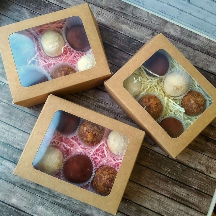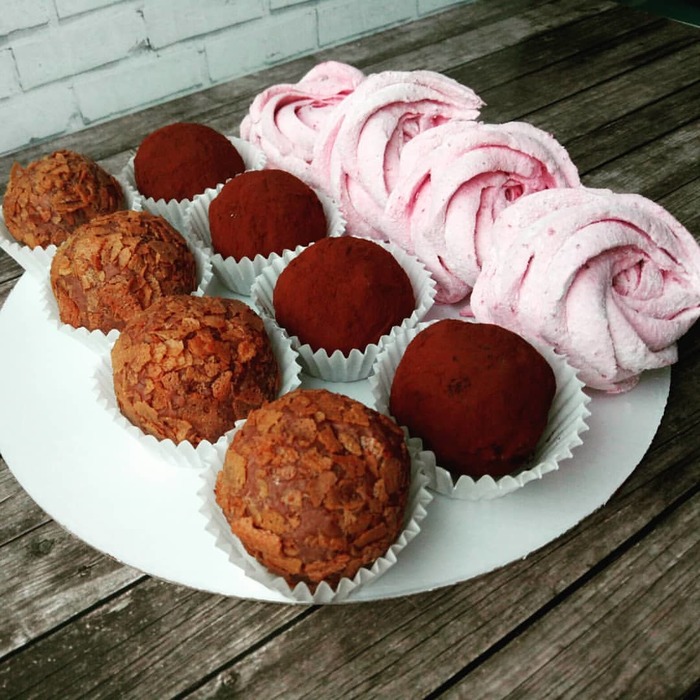 Трюфельные конфетки с разными вкусами из настоящего бельгийского шоколада. Часто бывают в комплекте с зефиром. Вкусы разные. Тёмный шоколад - ром, молочный шоколад - фундук, белый шоколад - кокос.