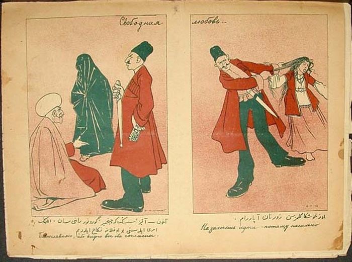 Принудительный брак - тема для иллюстрации с надписью на русском языке « Свободная любовь» - Свободная любовь. Важно отметить, что читать надо изображения справа налево, как в арабском языке, используемом в то время в Азербайджане.