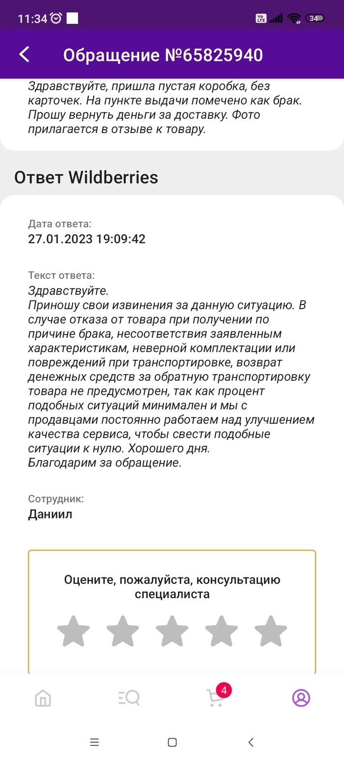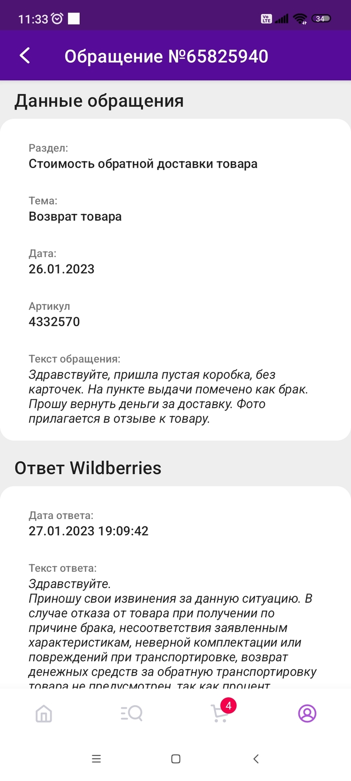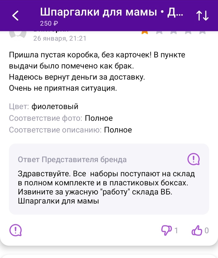 Т.е. вы, доставили товар не в полной комплектации, просто пустую коробку без самого товара!, по факту я его не получила, но деньги с меня сняли за возврат и не вернули. Вот у меня возник вопрос: Wilberries, вы совсем ах*ели?