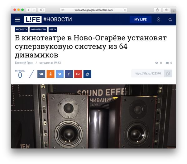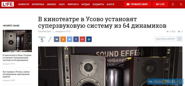 Вечером 20 июня издание «Лайф» опубликовало заметку «В личном кинотеатре Путина установят суперзвуковую систему из 64 динамиков». В тексте утверждалось, что в личном кинотеатре президента в его резиденции в Ново-Огарево установят систему из 64 динамиков. Копия этой заметки осталась в кеш гугла