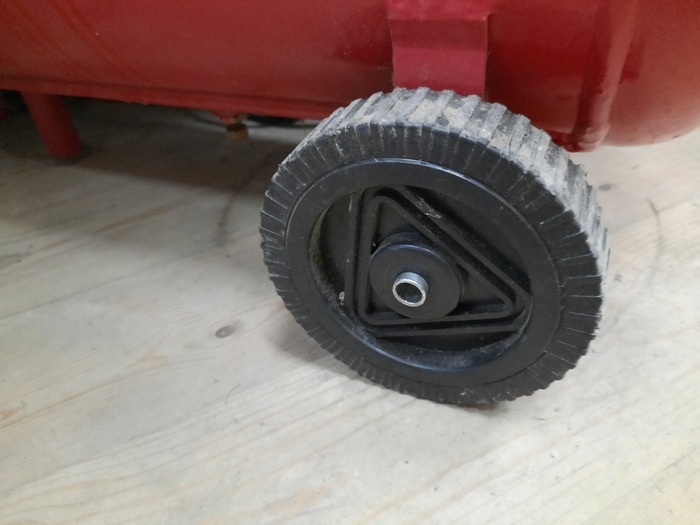 Редко он использовался по многим причинам, но одна из них не давала мне покоя уже давно. Дело в том, что достаточно сомнительная конструкция крепежа колесиков компрессора к оси проявила себя ожидаемым образом и дала сбой - отвалилась и потерялась маленькая пластиковая заглушка, не дающая колесу слететь с оси при его перекатывании.