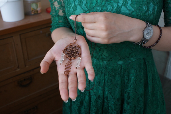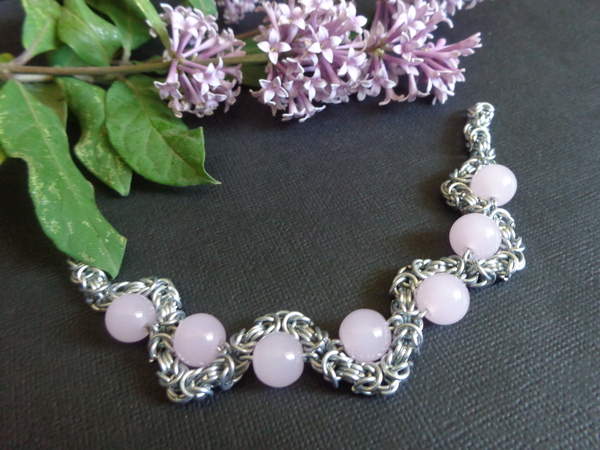 Подвеска: лёгкое кружевное плетение Helm weave кольца из проволоки 0.9мм, внутренний диаметр 3.5 и 5 мм соответственно, длина цепочки около 40 см, удобная застежка.