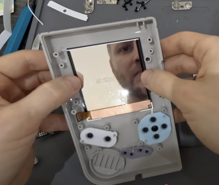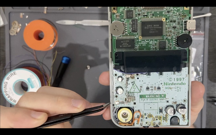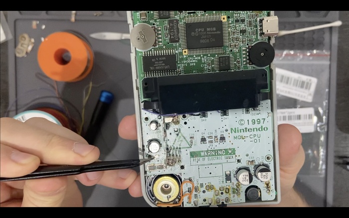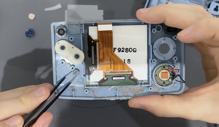 Это успех. Светодиод горит, звук есть, кручу контраст - появляется картинка. Всё работает! Дисплей почти целый - лишь одна вертикальная линия не прорисовывается. Её можно попытаться восстановить прогревом - как я делал на Game Boy в этом посте. Но есть риск усугубить ситуацию, так что решаю оставить как есть.