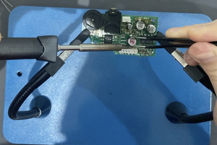 На плате питания – выпаиваю старые выводные конденсаторы, очищаю отверстия, ставлю новые конденсаторы.