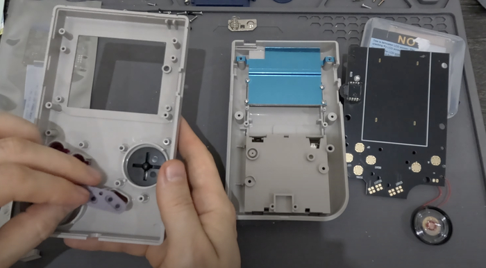 Ещё при разборке увидел, что многие стойки, в которые вкручиваются болтики, сильно растрескались. Так что у корпуса не только косметические потёртости, но и более существенные проблемы. Начинаю сборку. В комплекте к корпусу идут новые кнопочки, резиночки, болтики, контакты для батареек и плата под кнопки и экран с новым динамиком.
