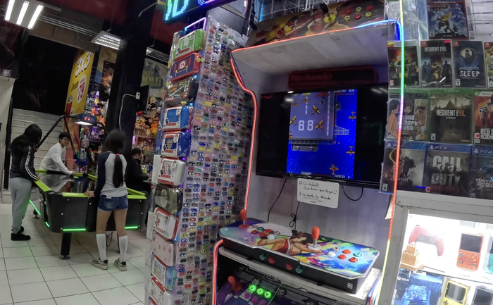 На входе сразу вижу аэрохоккей и магазин с играми, консолями и запчастями.