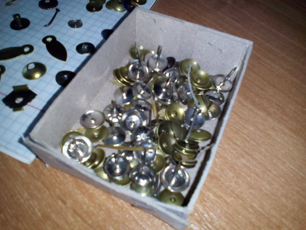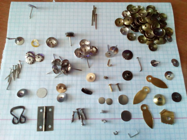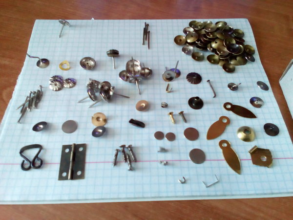 Конкретно здесь речь идет о коробочках декоративных гвоздей, в каждой из которых по 100 грамм этих самых гвоздей. Теоретически, 167 штук. Слева вверху на листе отдельно лежит то, что должно быть на самом деле. Но, конечно же, есть брак. Сложно сказать, сколько потребовалось перебрать всего гвоздей для сбора этой коллекции. Но соотношение брака/несоответствия колеблется от 1:5 до 1:10, т.е. 10-20%.