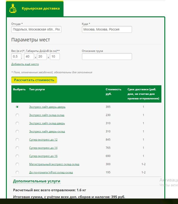 Замечательно, очень интересно и оригинально, ну ок. Заходим в раздел "Расчет стоимости", вводим города отправления/доставки, примерный вес груза, старалась лучше в бОльшую сторону, а то мало ли. И вот, что получаем.