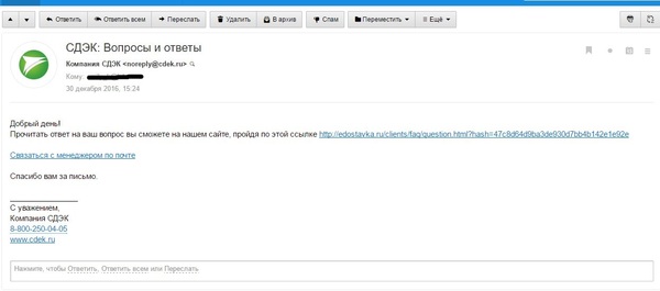 30-ого декабря моя мама уехала в Минск, а моя знакомая оформила возврат, так как в омерзительной компании СДЭК по истечении семи дней с даты оформления за последующие дни хранения на их ни черта не работающем складе надо платить!  Ни копья мы им платить не хотели, а я в этот же день написала жалобу в Роспотребнадзор, в бестолковой надежде, что хотя бы это должно помочь.  И знаете? Перед тем как ее писать, я все же должна была ведь убедиться, что я права. Мало ли, действительно, я преувеличиваю, с девушкой-оператором слишком грубо говорила, а сроки доставки у них вообще другие..  В связи с чем по форме обратной связи на сайте компании я задала вопрос, сколько времени занимает доставка типом экспресс-лайт по Москве и МО...?
