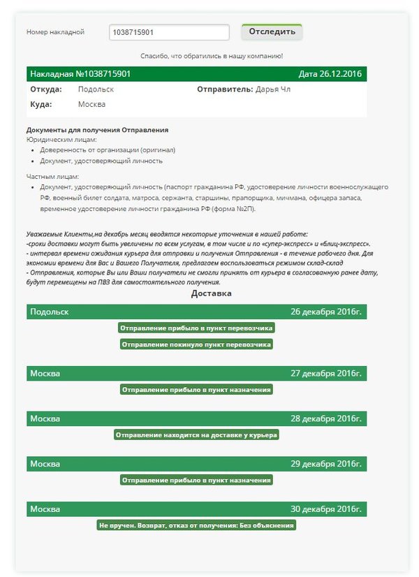 26-ого декабря 2016 года была оформлена доставка типом экспресс-лайт из Подольска в Москву, которая по заверению сотрудников отдела в Подольске должна будет занять 2-4 дня, но "до 30-ого декабря точно доставят". "Чудненько", - подумали мы, а я стала с нетерпением ждать доставки.