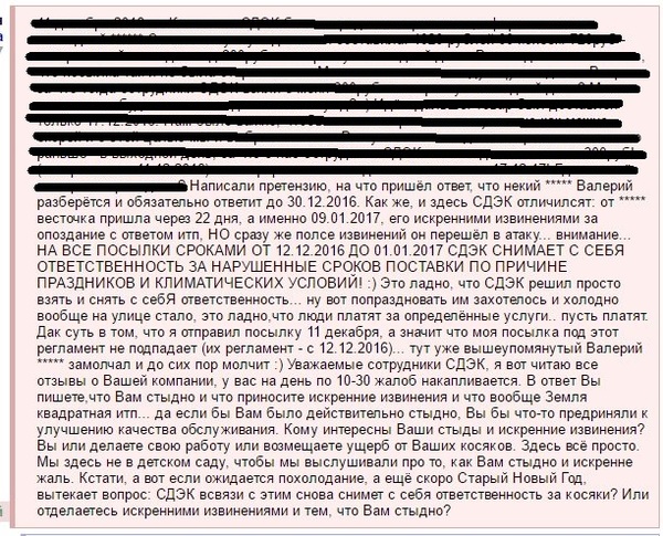 Занимаясь ожесточенными поисками различной информации по данной теме в интернете, я наткнулась на сайт с отзывами о курьерских службах (едост.ру). Нашла СДЭК. Сколько там подобных жалоб, некоторые почти один в один, как моя. А еще там даже есть ответы "менеджера отдела качества") И знаете, такое чувство, что компания вечно пытается снять с себя ответственность. Это мерзко и низко. В стране не режим ЧП, чтобы так рьяно списывать больше месяца негодований клиентов на холод и праздники. Нанимайте больше сотрудников что ли в декабре. Ах да, оказывается, они 7-ого декабря 2016-ого выложили на сайте уведомление о том, что будет большая загруженность. Типа сняли ответственность, я не пойму?
