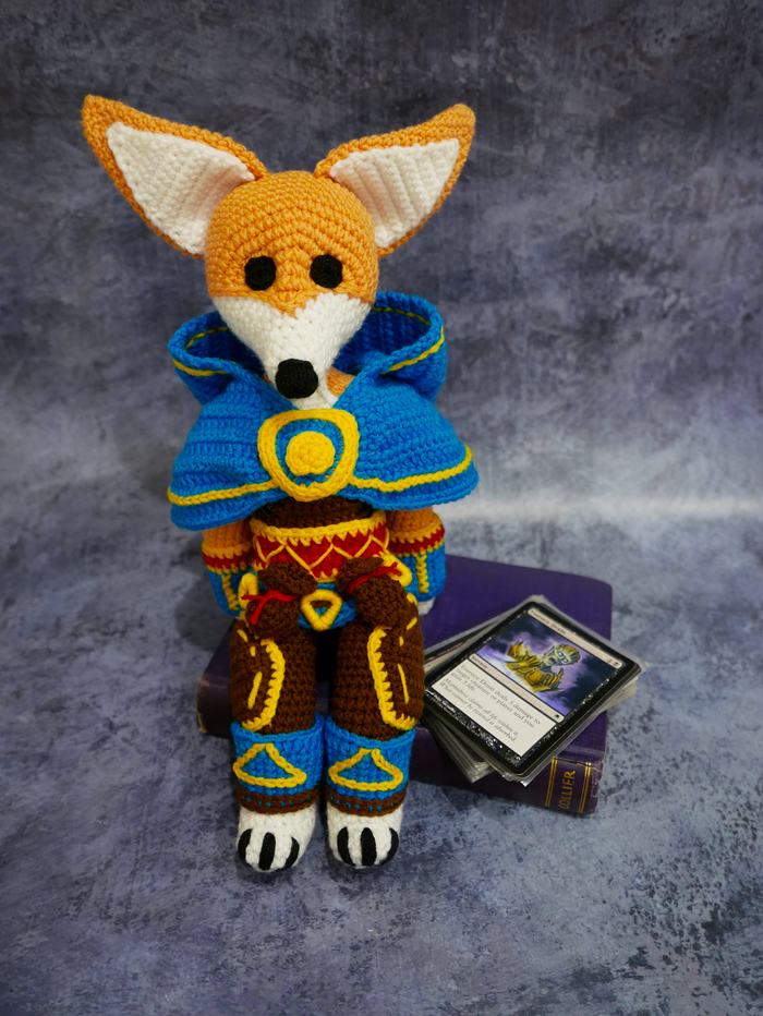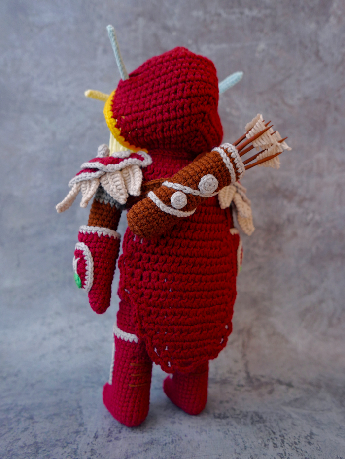 Материалы: акриловая и хлопковая пряжа, холлофайбер, проволочный каркас, магниты для крепления оружия.