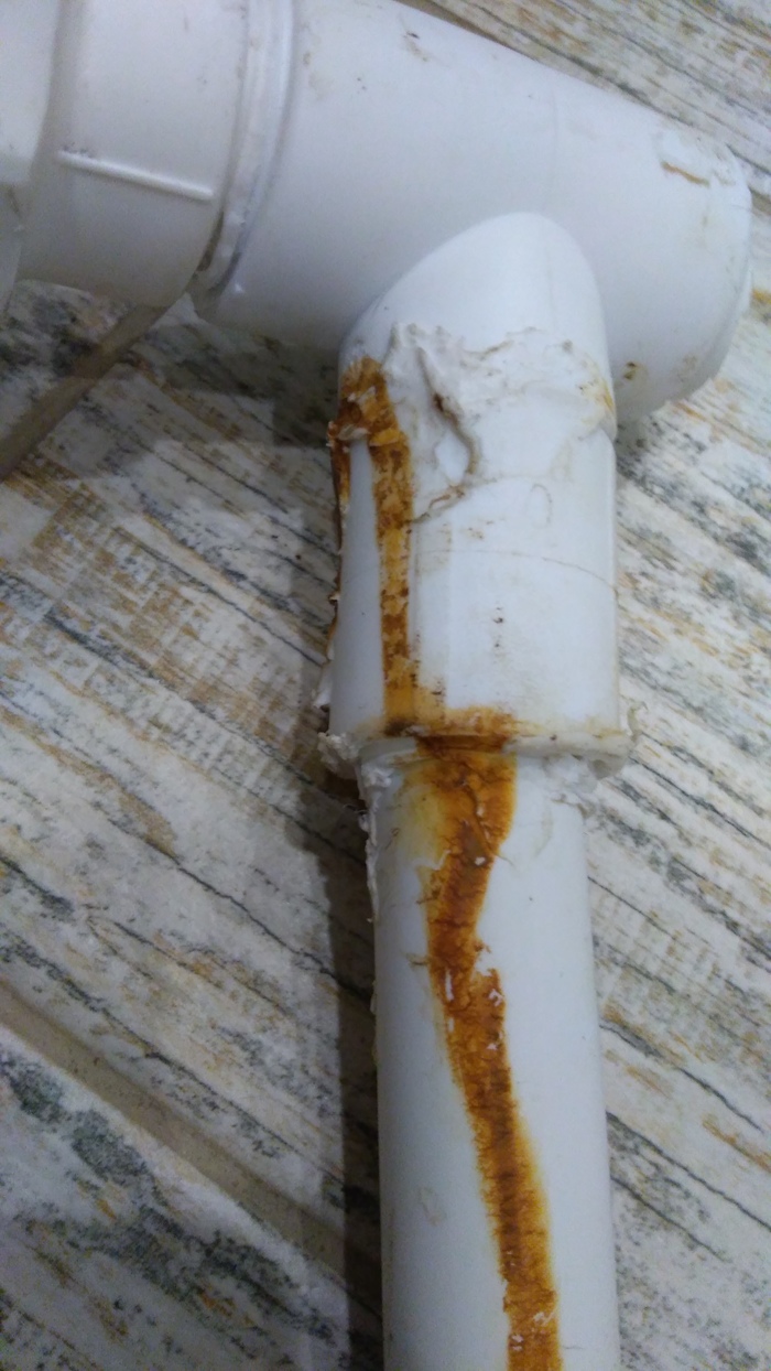 Итак, вскрыла я короб и, конечно, увидела лужу, плесень на стене, на полу, ржавчину на трубе, в общем все сопутствующие заливу прелести. Что же делать, пришлось снова пытаться дозвониться до Андрея – тишина. Отправила ему фотографии разрушений в мессенджер. Сообщение просмотрено – ответа нет. Расстроилась, плюнула на все, вызвала местных сантехников, которые за 6к (вместе с материалами) заменили мне косячный кусок трубы. Старый текущий отрезок на фото ниже.