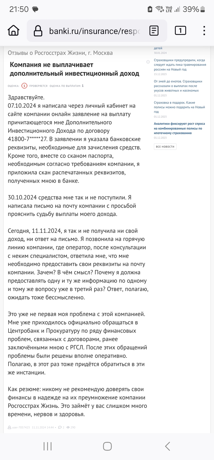 У меня с этой компанией и ранее возникали проблемы (к сожалению, после смерти мужа я была в стрессовом состоянии и заключила через банк целый ряд инвестиционных договоров страхования жизни с РГСЛ). Мне даже пришлось обратиться в Центробанк, Генпрокуратуру и Росфинмониторинг, чтобы решить ряд проблем, связанных с РГСЛ.