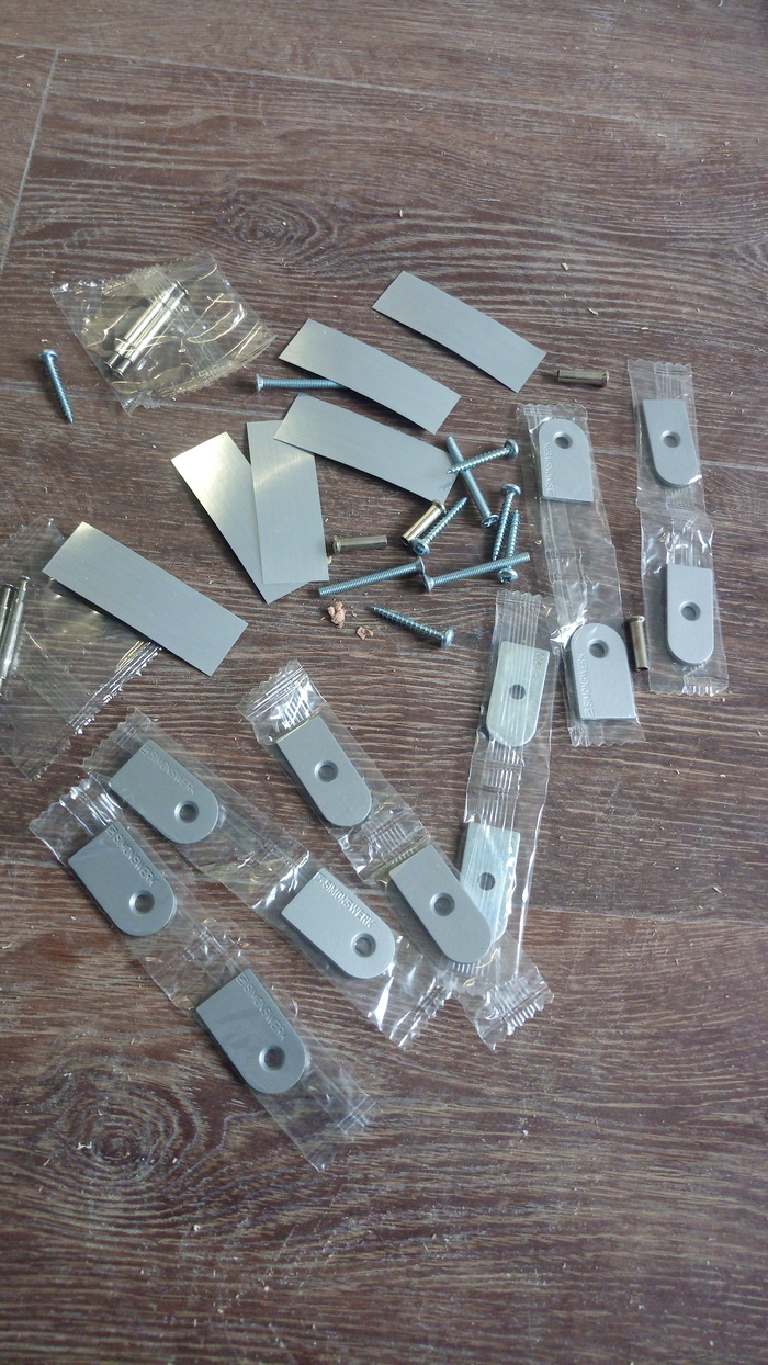 С дверью прямого открывания вопросов по комплектации не возникло.В дверях обратного открывания комплект фурнитуры для установки заглушек на петли и ручек выглядит так: