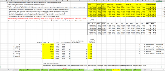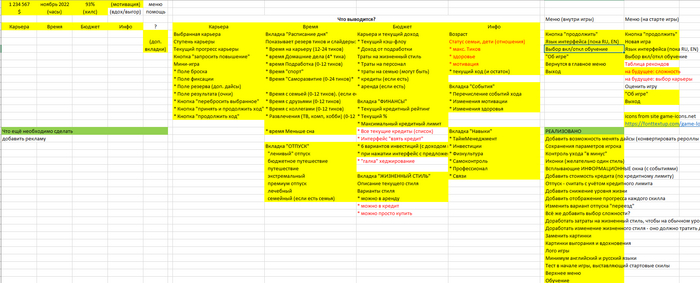 Короче, я начал переносить информацию из Xmind в эксель. На каждый основной элемент игры создавал вкладку и расписывал этот элемент. Местами просто текстом, местами - таблицы, местами - формулы. В общем, к финалу выглядит всё так (выбрана одна страница):