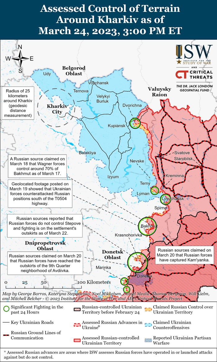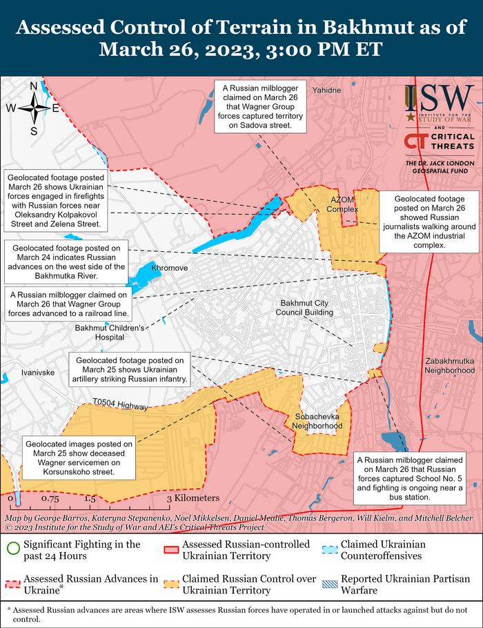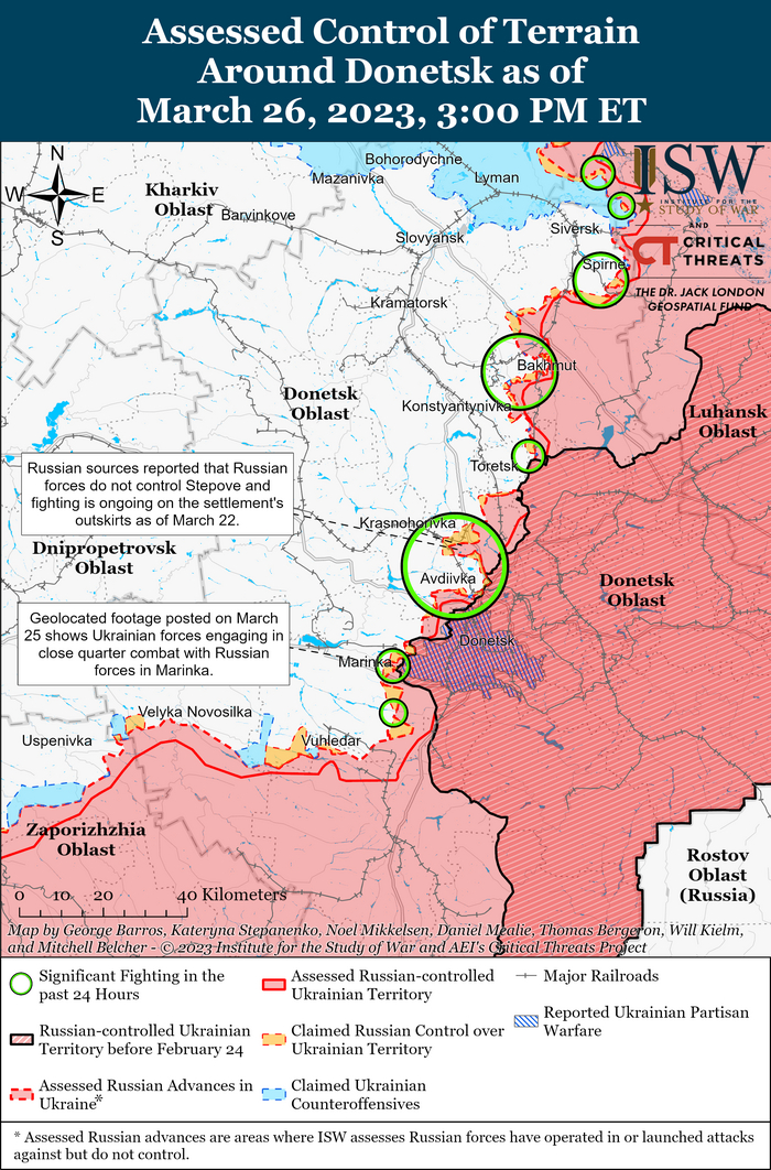 Российские войска продолжали наземные атаки в Бахмуте и его окрестностях, а также вдоль линии Авдеевка-Донецк.