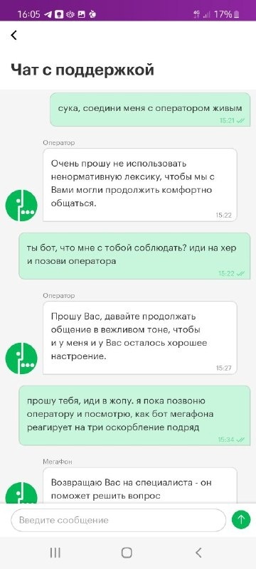 Снова сверяю баланс. Снова плюс. Звоню в Мегафон. Оператор объясняет мне, что т.к. кэшбек действует каждый месяц, 1-го октября он снова включился и у меня снова "технический долг". Спрашиваю, какого черта меня не предупредили об этом 30-го сентября. Внятного ответа нет.
