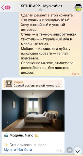 Мне самой этот эксперимент показался увлекательным. Для быстрых решений и проверки идей Setup.app оказался максимально практичным инструментом. Он не заменяет полный проект с чертежами и ведомостями, но помогает увидеть будущий интерьер. Если нужно проверить решение, просто пишу боту — и через пару минут вижу результат.