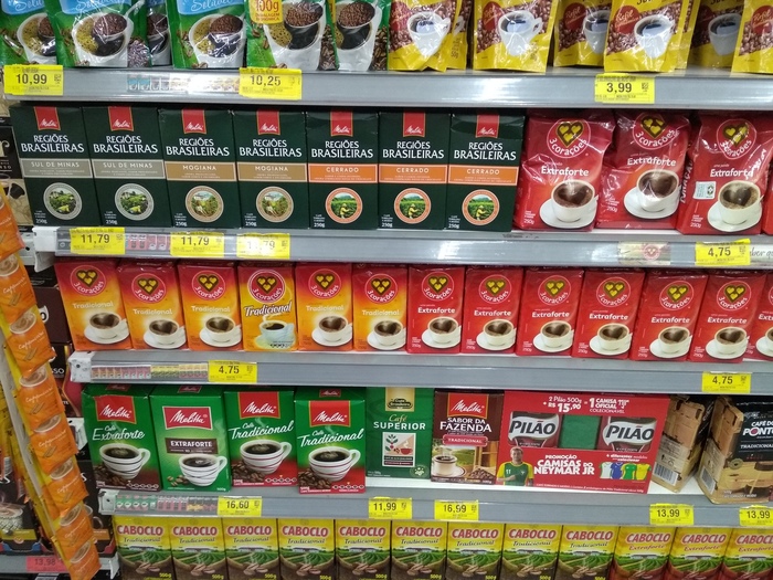 Ну и, конечно же, классика Бразилии - кофе. На разных вкус, цвет и кошелек. В среднем цена за 250 г кофе около 5 реалов. Более "элитный" кофе начинается от цены 14 реалов.