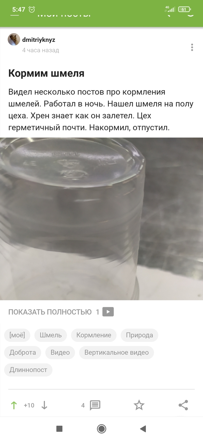 Видел несколько постов про кормления шмелей. Работал в ночь. Нашел шмеля на полу цеха. Хрен знает как он залетел. Цех герметичный почти. Накормил, отпустил.