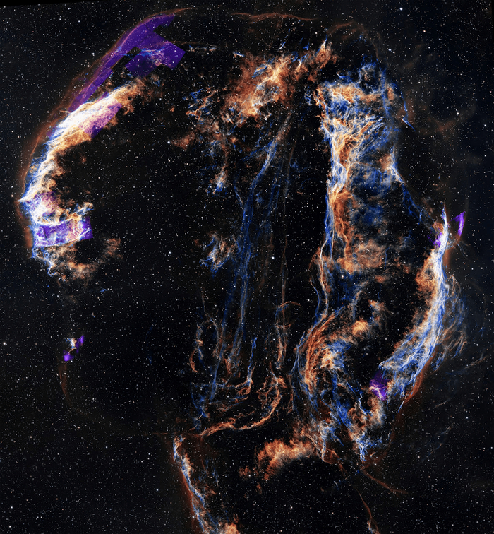 Петля Лебедя (Туманность Вуаль) — это гигантский остаток сверхновой, образовавшийся после взрыва массивной звезды. Расположенная в 2400 световых годах от Земли, эта туманность простирается на 110 световых лет в диаметре.