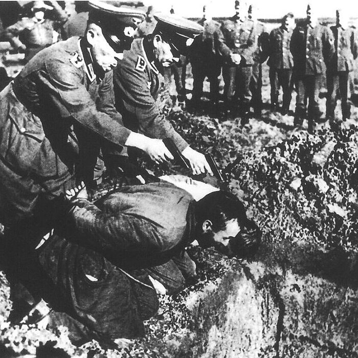 На снимках изображено, как гестаповцы расстреливают советских людей. Вы видите обыкновенных рядовых русских крестьян, им связали руки, поставили на колени перед ямой и немецкие палачи готовятся пустить им пулю в затылок. Коротконогий немецкий фельдфебель вместе со своими подручными творит эту страшную расправу. Фельдфебель готовится застрелить беззащитных людей. Он спокоен, этот фашист, эта бешеная немецкая собака! Для него расправа — дело привычное