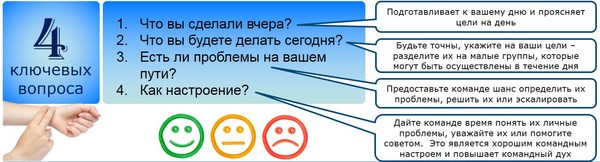 - Использование ежедневно 15-минутного промежутка повысит коммуникацию и синхронизирует команду